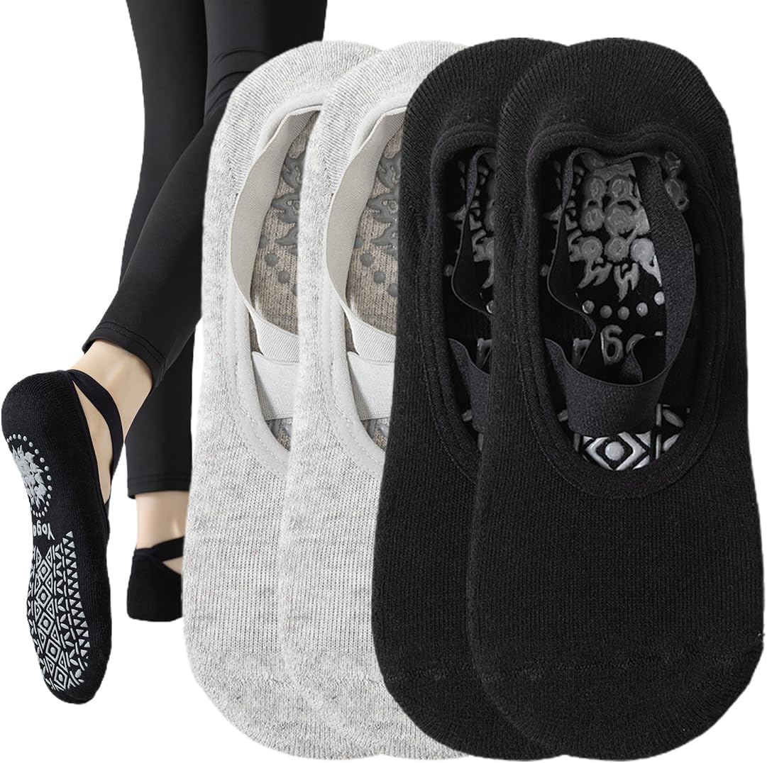 2 Pares Calcetines Pilates Antideslizantes para Yoga, Calcetines Yoga Antideslizantes para Mujer, Calcetines Antideslizantes para Mujer, Pilates, Pure Barre, Ballet, Danza Negro y Gris