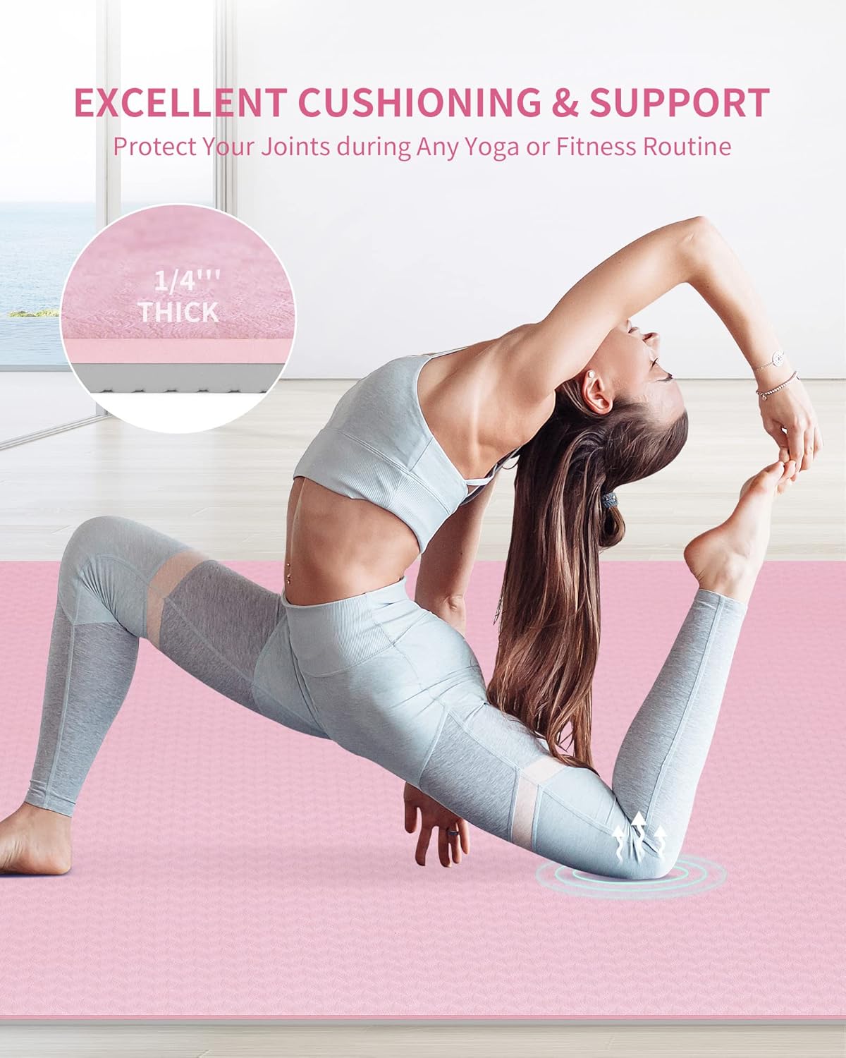 Material Ecológico de TPE: Esta esterilla yoga está fabricada con materiales de alta calidad de TPE, que ofrecen una sensación suave al tacto y sin olores. Además, tiene propiedades de resistencia al desgaste, a la rotura y a la deformación. Su tecnología de espuma de alta densidad le brinda un excelente rendimiento de amortiguación y absorción de impactos, cuidando cuidadosamente sus rodillas, tobillos y articulaciones en general.